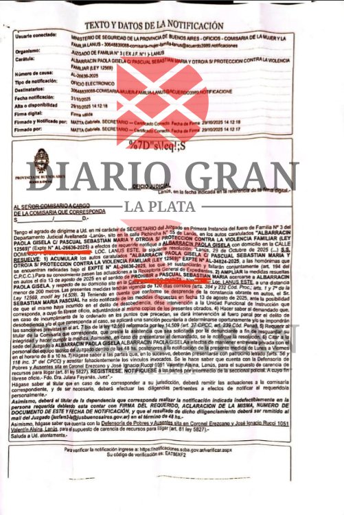 Según el oficio judicial, firmado por la secretaria del tribunal, Gisela Matta, el juez dispuso que el legislador no podrá acercarse a menos de 200 metros de la denunciante durante un plazo de 120 días corridos, conforme a lo establecido por la Ley 12.569 de Protección contra la Violencia Familiar.